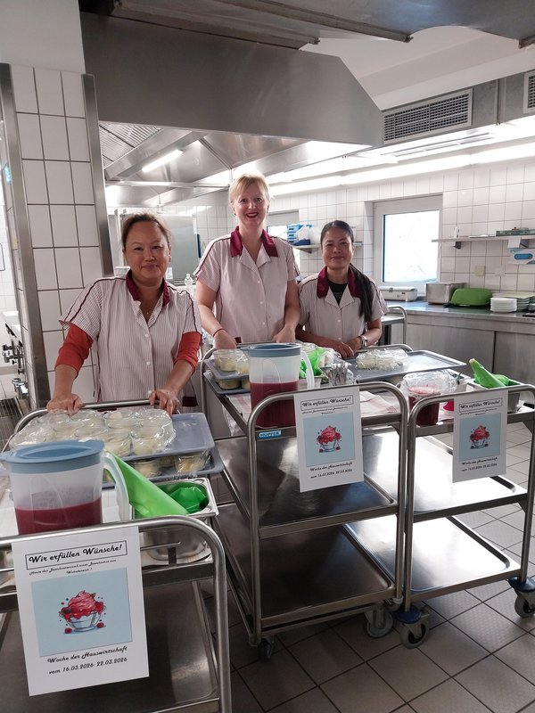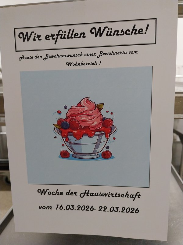 Im Rahmen der Woche der Hauswirtschaft in den Seniorenzentren der Arbeiterwohlfahrt vom 16.-22.03.2026 gab es für unsere BewohnerInnen am Mittwoch eine schöne Überraschung. Zur Kaffeezeit wurde kein Kuchen serviert, sondern leckeres Eis mit warmer Himbeersoße und Schlagsahne. Das Motto hieß “Wir erfüllen Wünsche.” Diese Leckerei hatte sich eine Bewohnerin bei einer der letzten Abfragen durch die Hauswirtschaftsleiterin Frau Runte-Trinkaus gewünscht.